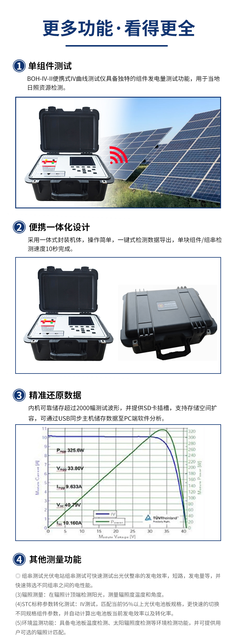 便携式IV测试仪采⽤⼀体式封装技术,操作界⾯功能说明清晰,⼀键式检测数据导出,单块组件/组串检测速度10秒完成,快速精准全⾯的检测功能可作为第三⽅检测机构与电站运维的⾸选配置。整机配备更为⾼精度的电容/电阻式负载,同时配备了更为快速的辐照计操作模块以及对应的IV曲线分析软件,可以更⾼清的解析IV曲线的同时具备持续IV不间断扫描的优势,助⼒光伏全体系电站的检测。